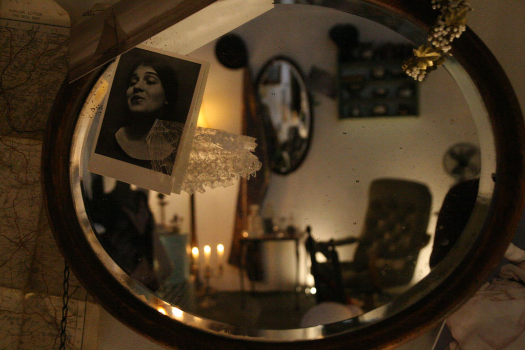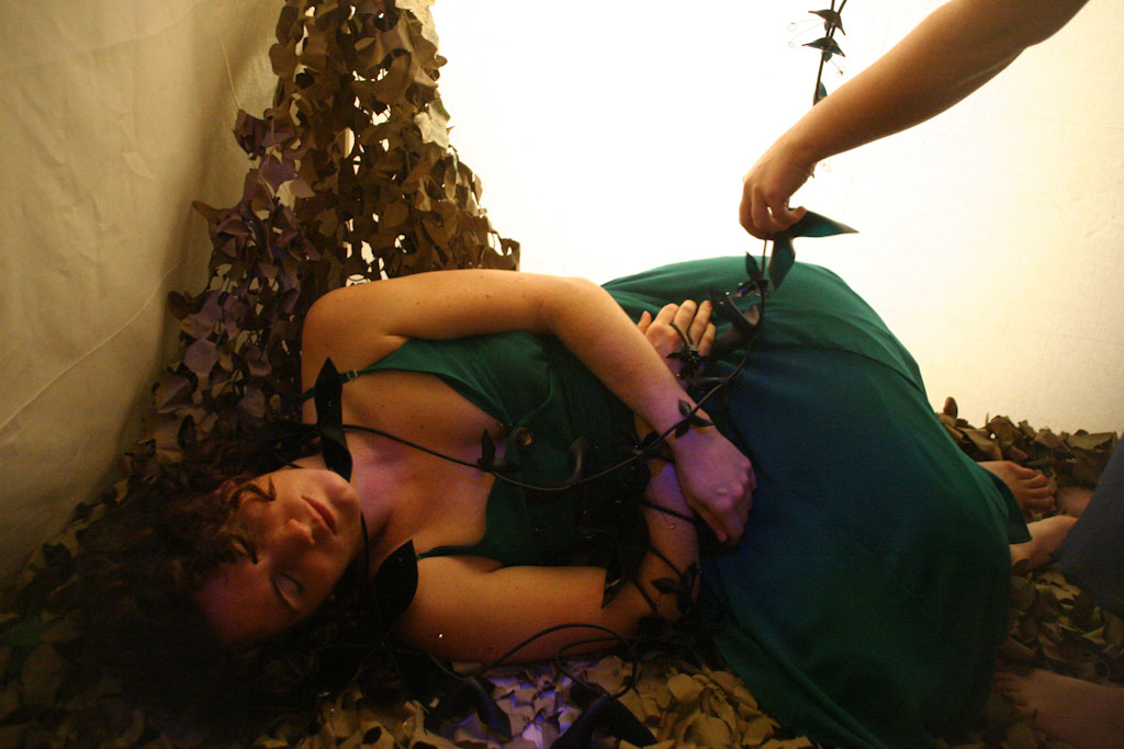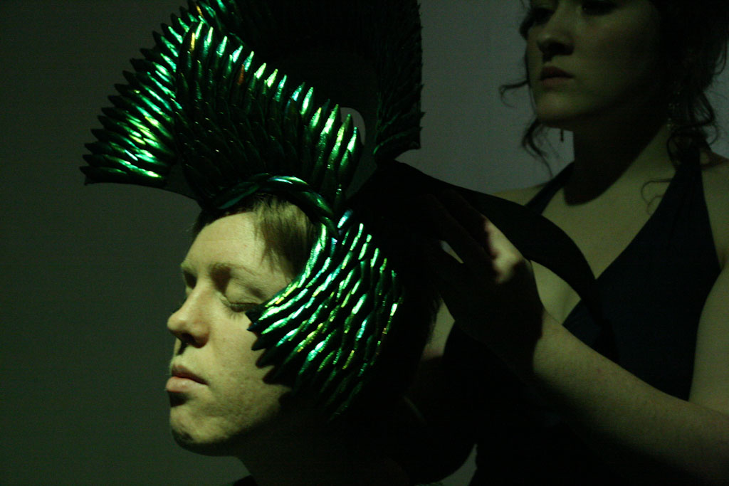 An envelope in a jewellery box prompts each patron to select their favourite from three mirrors, positioned amongst the antiques, after which a dresser leads them into a second antechamber where they become a participant in a ritual conceived around a piece of body jewellery matched to the décor and dressing of the chosen mirror. In a vestibule crammed with leaves, the patron is adorned with Louise Bryan’s ivy-tendrilled arm sculpture, before being suffused with light to create a silhouette which makes it appear that the plant is sprouting from within the patron themselves. Mikaela Lyons’ ruff made of maps folded into sharp concertinas initiates a circular odyssey on a makeshift sedan chair past suspended boxes of compact mirrors and decoupage sea-monsters. John Moore’s exquisite head-dress, decorated with iridescent beetle wings, forms the centrepiece of a wordless ceremony akin to an Egyptian coronation, with the patron as the revered Pharaoh.